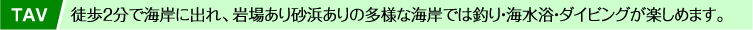 太平洋に向かう景色は抜群!徒歩2分で海岸に出れ、岩場あり砂浜ありの多様な海岸では釣り・海水浴・ダイビングが楽しめ、又海岸線に沿って遊歩道があり、自然を満喫しながらジョギングや散歩が楽しめます。