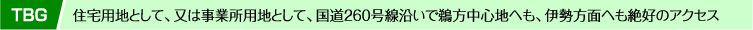 国道260号線沿いの広い土地。北側に国道260号線に接し、南側は市道に78m接して利用範囲が広い魅力の土地。中心地鵜方にも近く、伊勢方面にもアクセス良好。